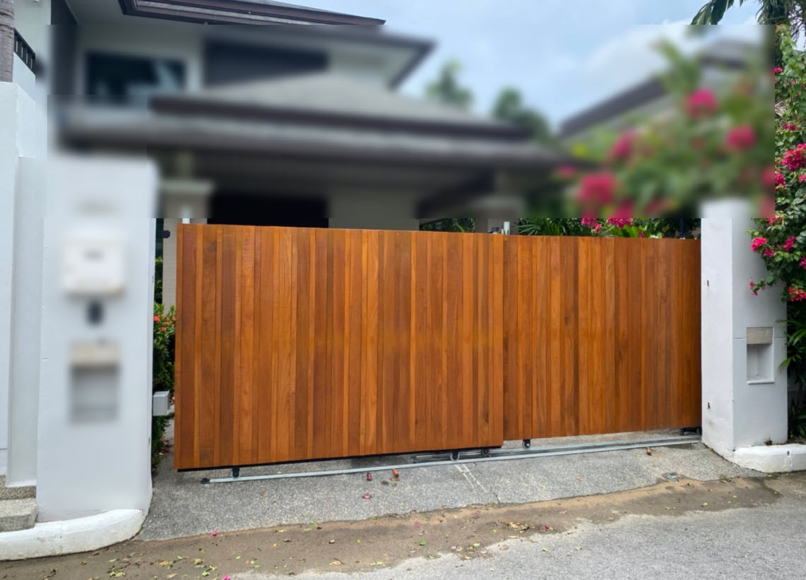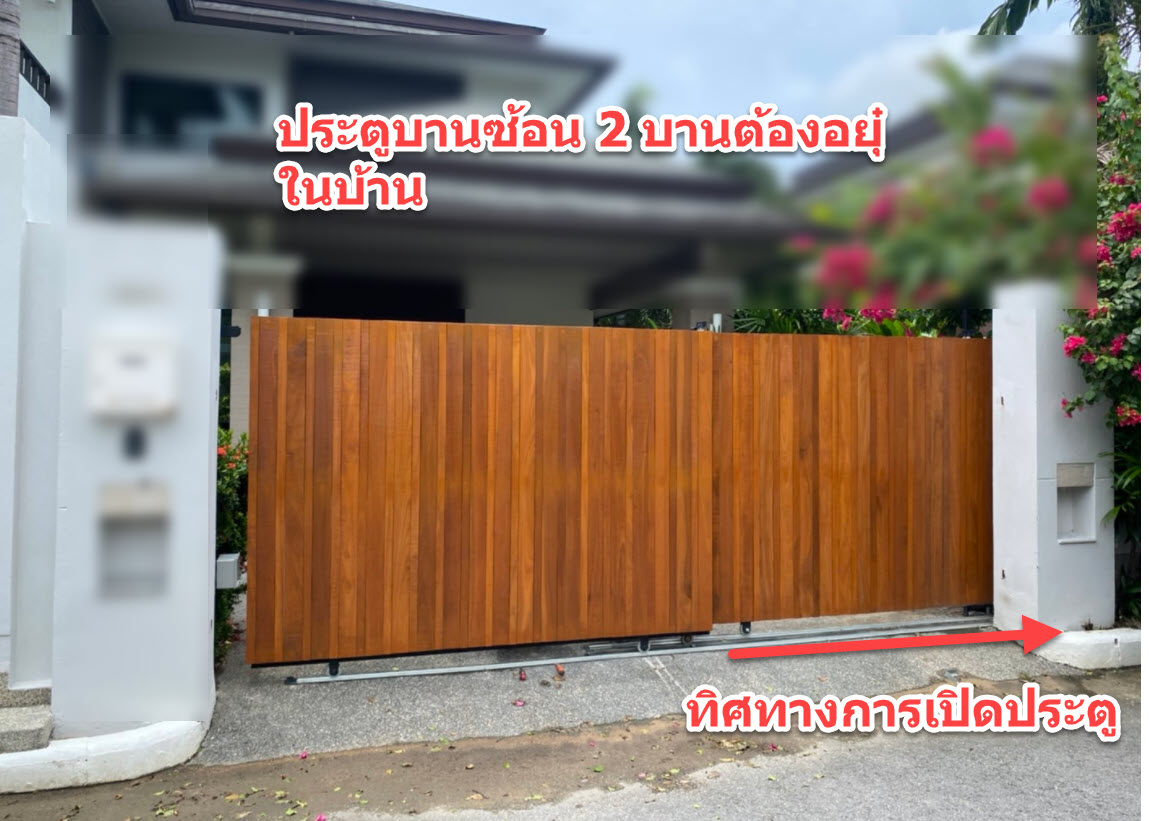 6. หากกำลังตัดสินใจว่า จะทำประตูเป็นประตูบานเลื่อนหรือบานสวิงดี ขอแนะนำว่าเป็นบานเลื่อนดีกว่าเพราะ ปัญหาน้อยกว่าและราคาของระบบประตูรีโมทถูกกว่า บานสวิง ประมาณ 50%